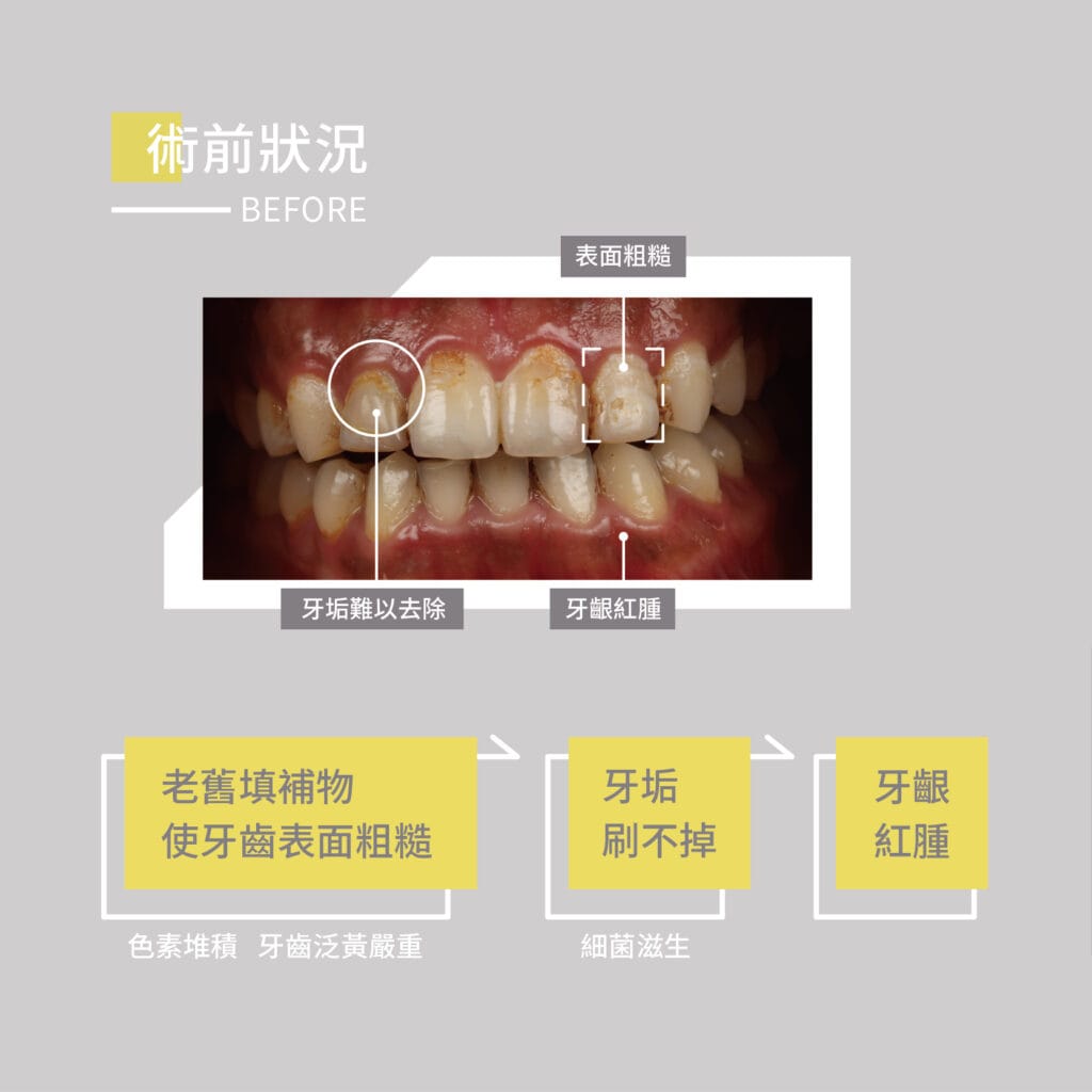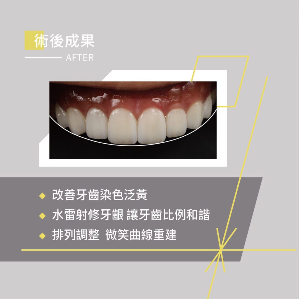 一個月牙齒大翻身案例背景Youtuber雞腿弟弟@getwie__因為牙齒泛黃的問題深受困擾且因蛀牙使用樹脂填填補補色素卡在表面導致整顆牙齒顏色不均勻也被粉絲們誤以為有吃檳榔的習慣實在讓雞腿不敢大方露齒笑透過比熊介紹來找林醫師諮詢貼片療程療後變化完成療程後的雞腿看到自己牙齒終於在螢幕前自然亮白 很滿意☺️治療規劃內容微笑曲線設計蛀牙以及牙齦發炎控制水雷射牙齦微整型美白陶瓷貼片*8針對牙色不均、蛀牙問題與牙齦比例調整,透過多項治療達成整體改善。