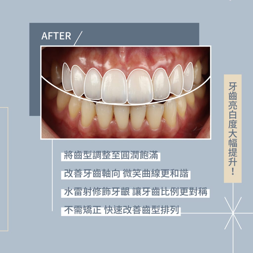 主要治療方式:林禹書醫師評估患者美觀需求,不需漫長矯正時間,直接做上8顆陶瓷貼片,關閉門牙牙縫,讓前牙8顆牙齒均勻對稱,同時恢復微笑曲線,與泛黃牙齒說掰掰。