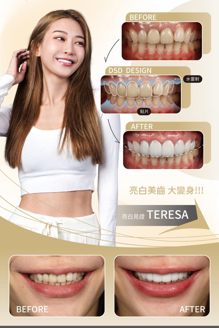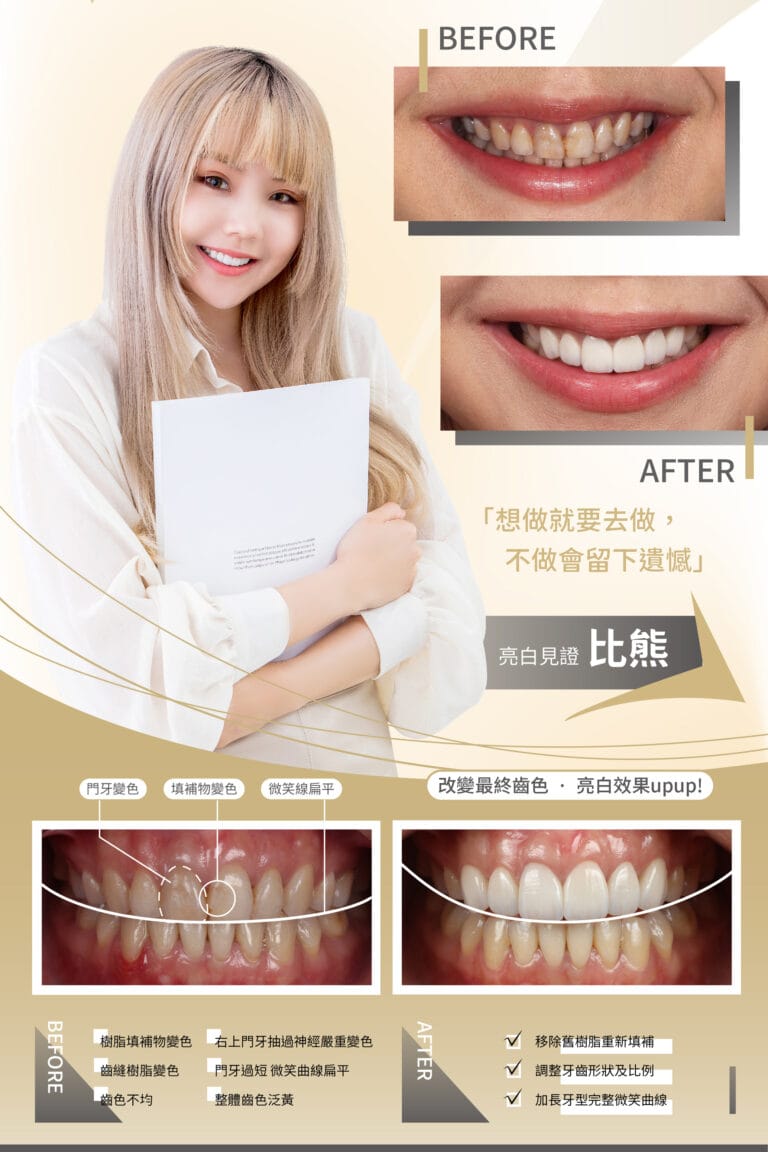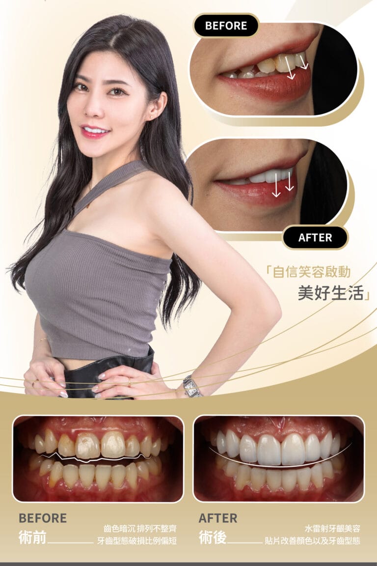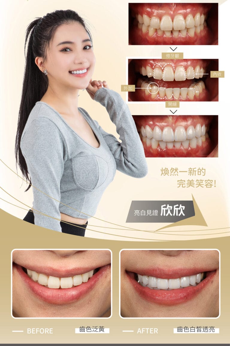 欣欣原本牙本質良好,但白度與外型仍不足以呈現完美微笑曲線。透過選用高透光度瓷塊製作上下16顆陶瓷貼片,成功呈現自然、亮白且不死白的質感。療程後的欣欣重拾笑容自信,社群中出現更多開朗大笑的照片,展現更迷人的風采。