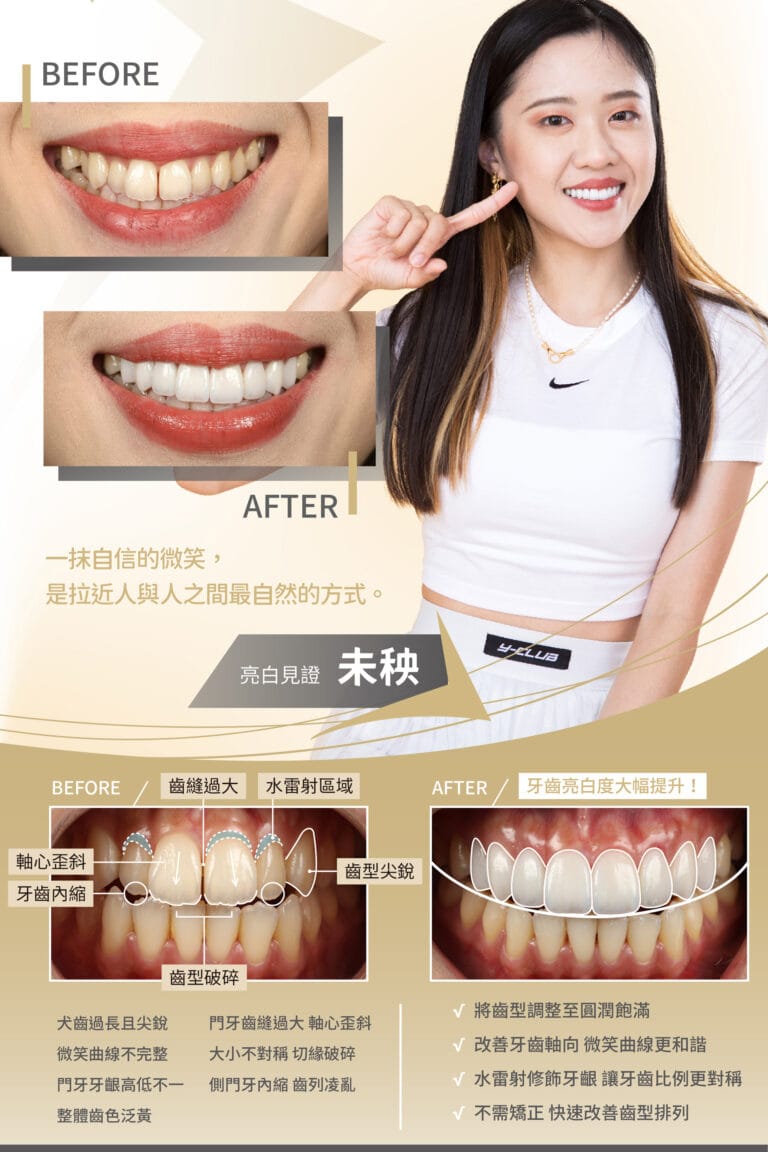 IG 網紅未秧因齒列不整與門牙牙縫造成微笑不自信,經林禹書醫師評估後,以 8 顆陶瓷貼片取代漫長矯正,改善牙縫、齒形與齒色,使前牙更對稱自然。完成治療後,她在直播與影片中更敢展現笑容,粉絲也直呼變化明顯,是提升自信的典型美學見證案例