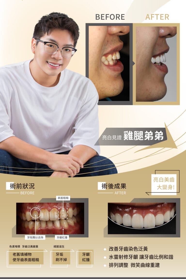 YouTuber 雞腿弟弟因牙齒泛黃、蛀牙與樹脂染色造成整體色澤不均,被粉絲誤認為有檳榔習慣,使他不敢露齒笑。透過介紹前往林醫師處進行諮詢,規劃微笑曲線設計、蛀牙與牙齦發炎控制、水雷射牙齦微整型及 8 顆美白陶瓷貼片,最終在鏡頭前呈現自然亮白的笑容。