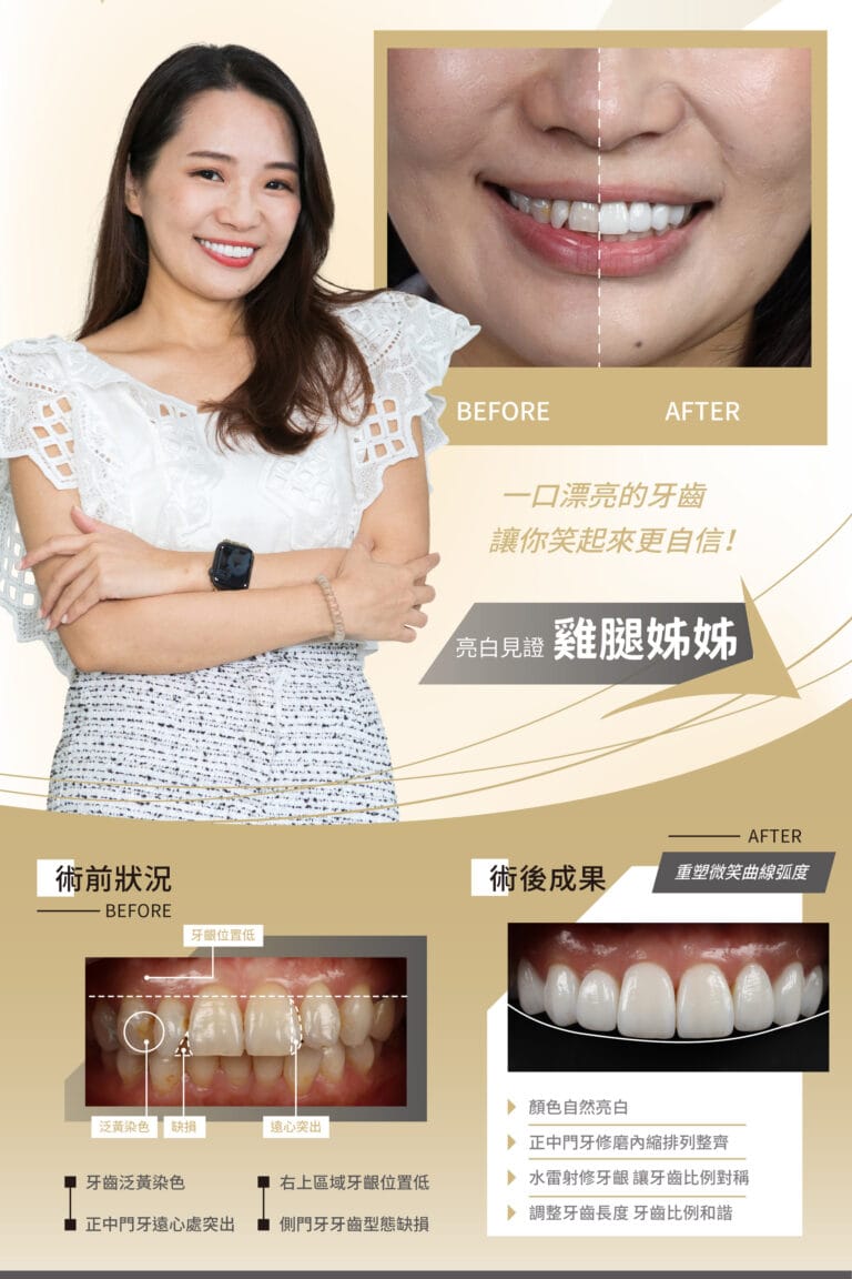 YouTuber 雞腿姊姊因牙齒微凸與齒色泛黃,希望在不進行漫長矯正的情況下改善外觀,因此規劃微笑曲線設計、牙齒微矯正、水雷射牙齦微整型與 8 顆美白陶瓷貼片。治療後牙齒亮白度、比例與微笑美感全面升級,呈現自然明亮的牙齒美學效果。