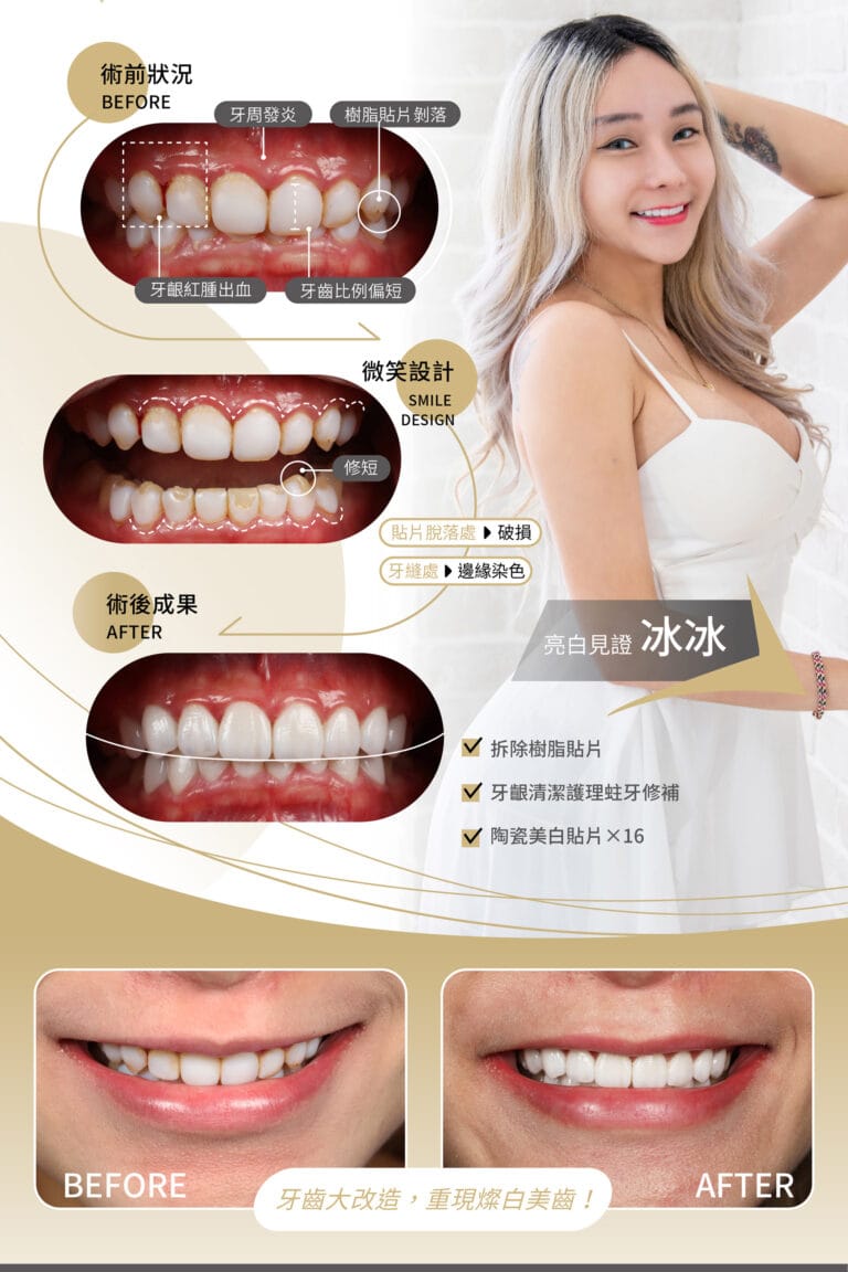 直播主冰冰因早期選擇非專業操作的樹脂貼片,出現紅腫、出血、剝落與染色等問題。經評估後重新規劃治療,包括卸除舊貼片、深層清潔、微笑曲線設計與16顆陶瓷貼片重建。完成療程後,她終於擁有亮白自然的自信笑容,改善過往影響鏡頭呈現的困擾。